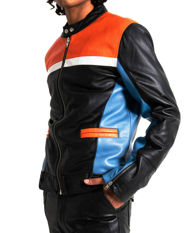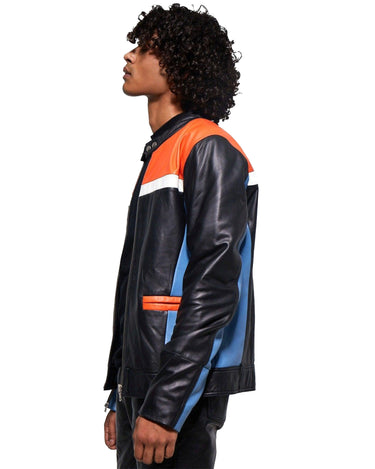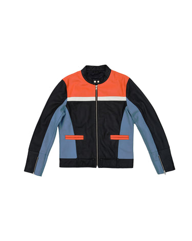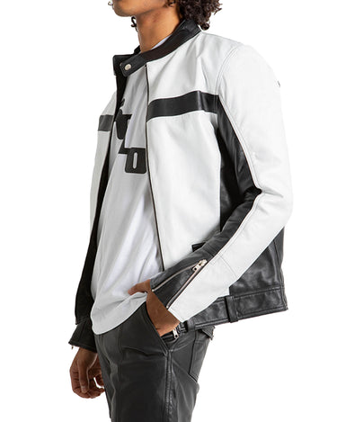 Intricately designed jacket features diamond quilt padding (inside) that adds dimension and weight to body of jacket, signature horizontal white strip across chest and back, and eyelet detailing on sleeve.